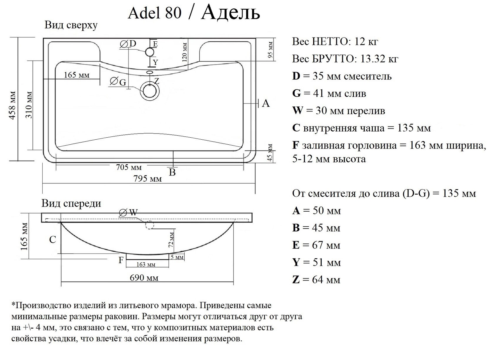 Функционально и комфортно организовать пространство позволит наличие горизонтальной поверхности, на которой можно разместить умывальные принадлежности непосредственно на раковине. Выполнена из высококачественного экологически безопасного материала – литьевой мрамор.