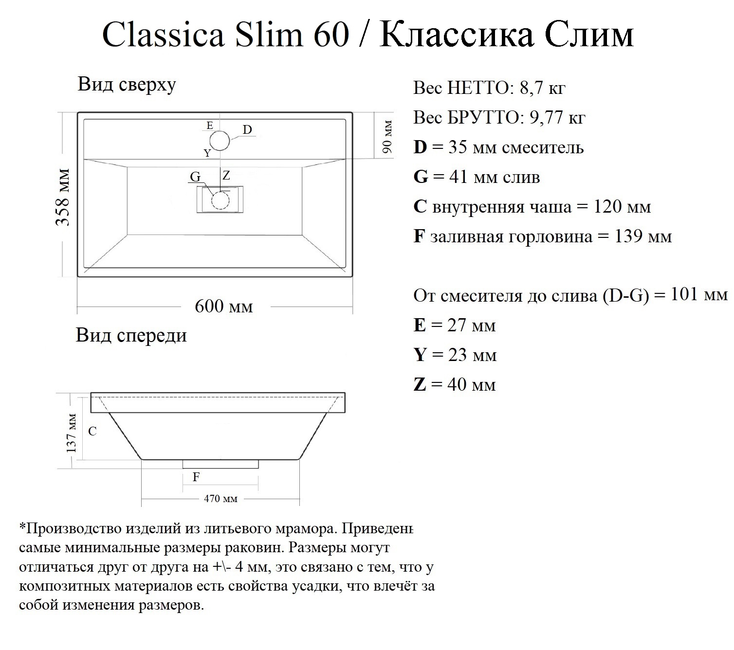 Раковина «Classica Slim»/КЛАССИКА СЛИМ одна из самых узких моделей раковин из литьевого мрамора. При этом имеет современный изысканный дизайн и элегантную форму, раковина станет украшением вашей ванной комнаты. Сочетается с любым интерьером. Универсальный белый цвет. Отверстие слива деликатно спрятано под съёмной крышкой. А наличие горизонтальной поверхности позволяет разместить умывальные принадлежности непосредственно на раковине, что позволит функционально и комфортно организовать пространство.