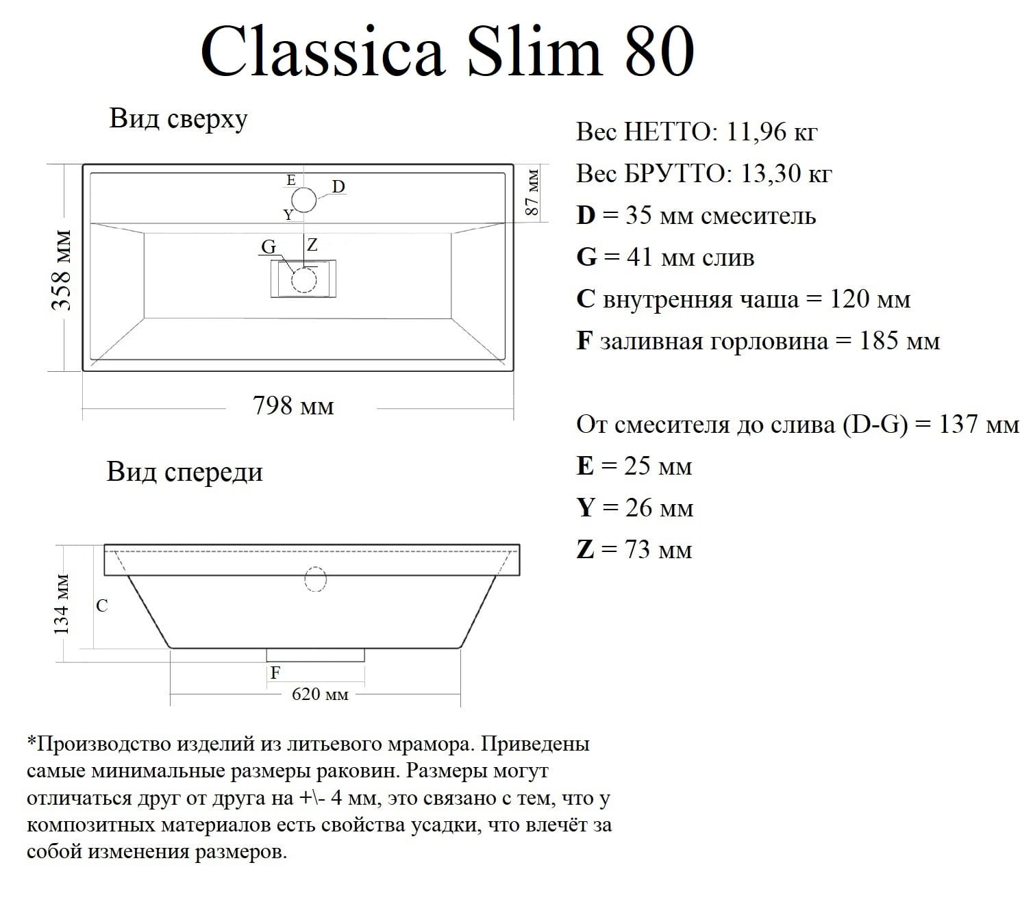 Раковина «Classica Slim» одна из самых узких моделей раковин из литьевого мрамора. При этом имеет современный изысканный дизайн и элегантную форму, раковина станет украшением вашей ванной комнаты. Сочетается с любым интерьером. Универсальный белый цвет. Отверстие слива деликатно спрятано под съёмной крышкой. А наличие горизонтальной поверхности позволяет разместить умывальные принадлежности непосредственно на раковине, что позволит функционально и комфортно организовать пространство.