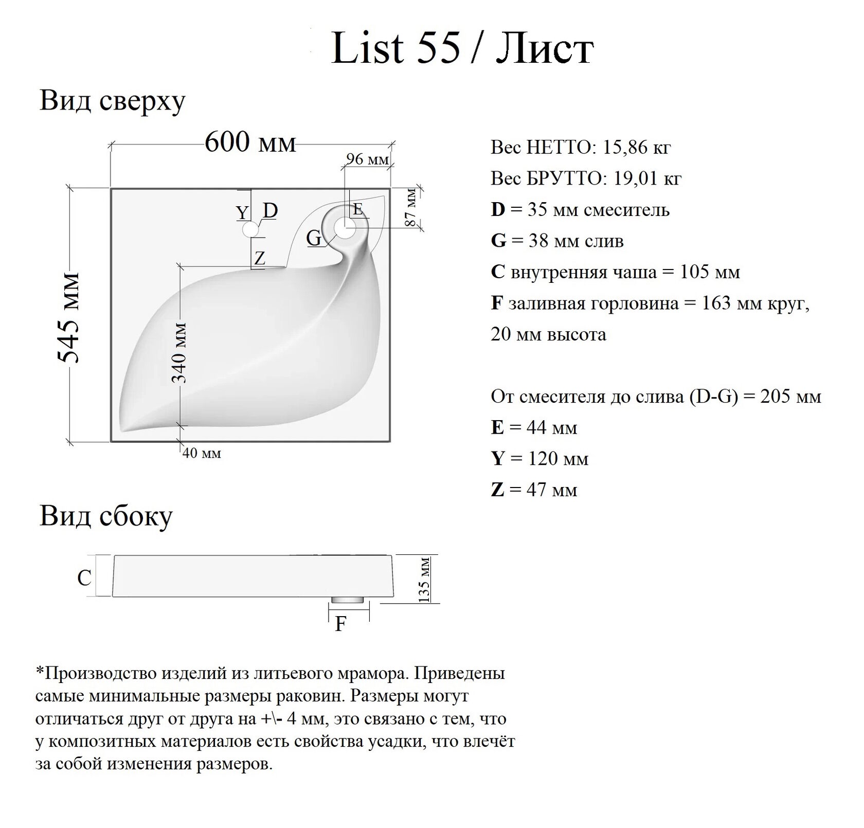 Отверстие слива деликатно спрятано под съёмной мыльницей в виде листа. Выполнена из высококачественного экологически безопасного материала — литьевой мрамор.