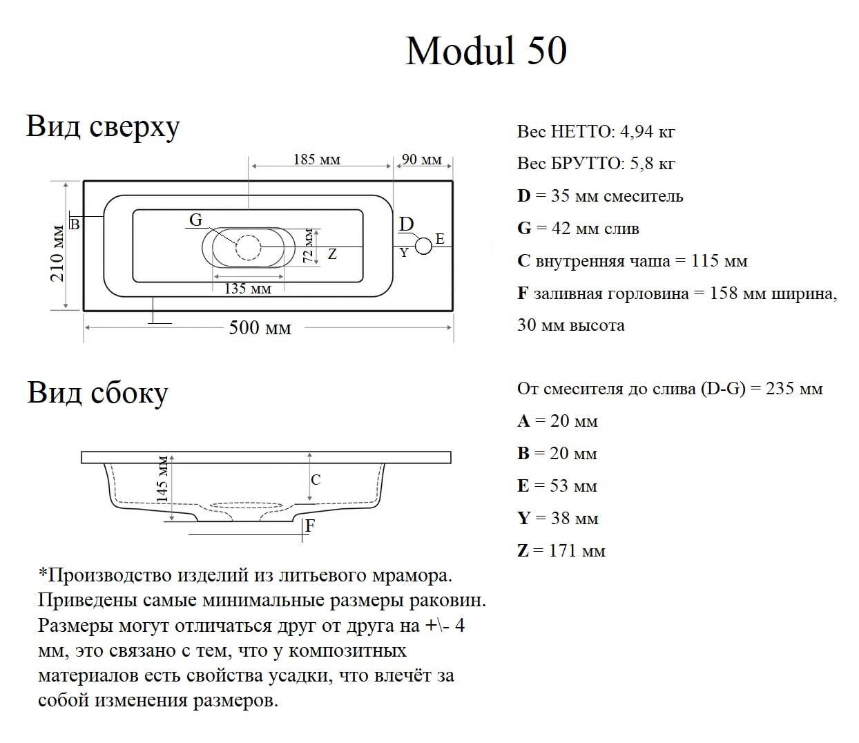 Раковина для ванной комнаты коллекции «Modul» лаконичная и практичная прекрасно подойдёт для небольших ванных комнат или санузов. Современный стиль и экономия пространства всё это собрано в одной раковине. Возможна установка на кронштейны и мебельную тумбу. Место слива деликатно скрыто под накладной крышкой. Раковина выполнена из высококачественного экологически безопасного материала — литьевой мрамор.