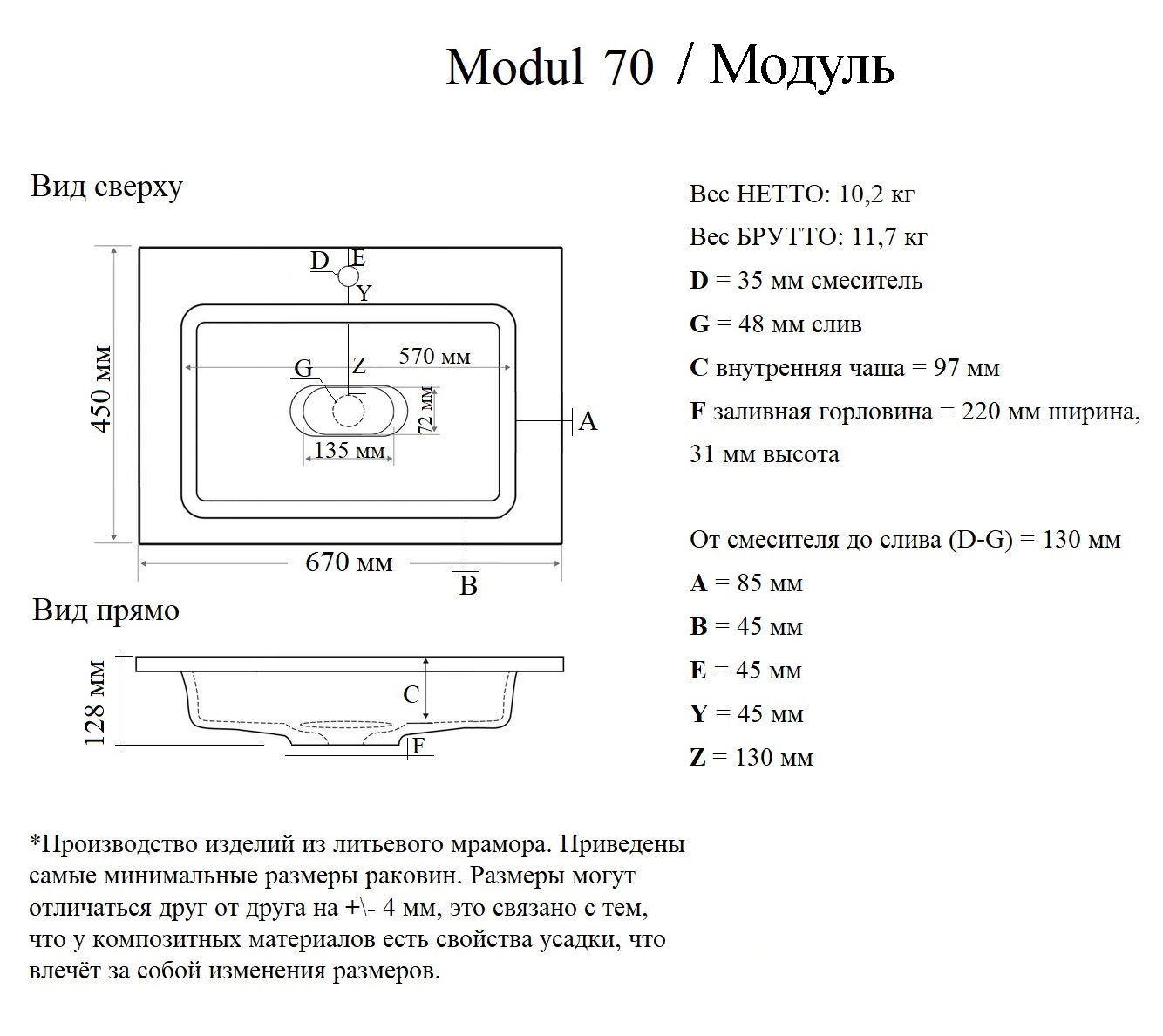 Функционально и комфортно организовать пространство позволит наличие горизонтальной поверхности, на которой можно разместить умывальные принадлежности непосредственно на раковине. Возможно несколько вариантов установки: на кронштейны, на мебельную тумбу, на столешницу. Раковина выполнена из высококачественного экологически безопасного материала — литьевой мрамор.